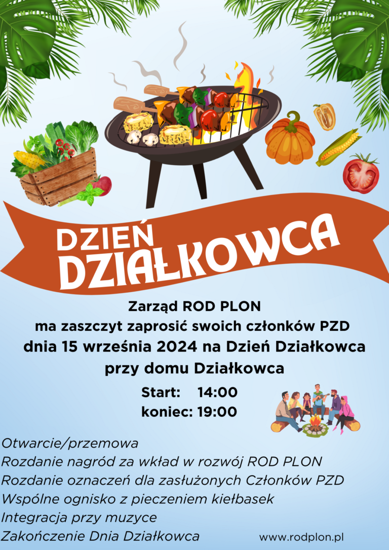 Zarząd ROD PLON ma zaszczyt zaprosić swoich Członków ROD PLON na Dzień Działkowca, który odbędzie się dnia 15 września w niedzielę o godzinie 14:00 na terenie ROD PLON przy budynku Zarządu. Zarząd ROD PLON rozpocznie mową i podziękowaniem oraz podziękuję…