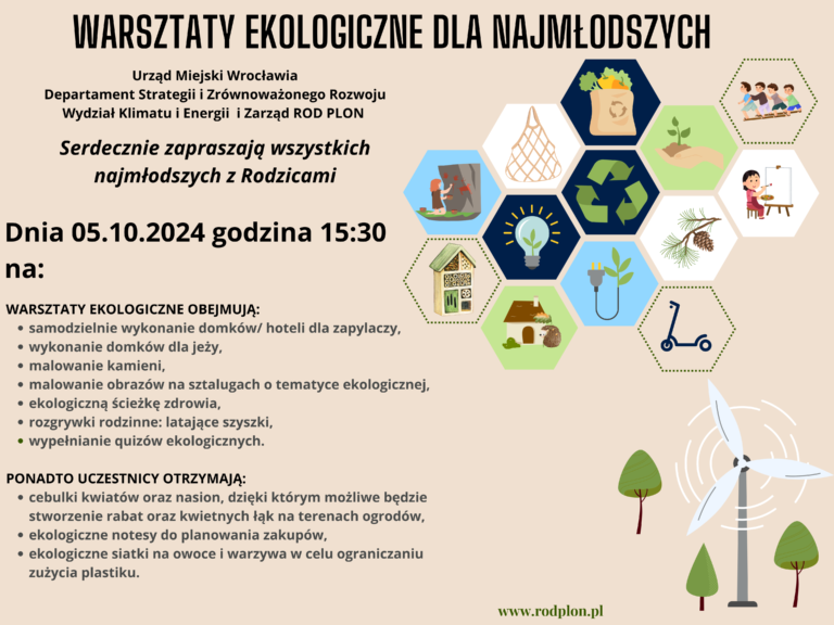 Warsztaty ekologiczne dla najmłodszych na terenie ROD PLON organizowane przez Urząd Miasta Wrocławia przy współpracy Zarządu ROD PLON. Dnia 05.10.2024 godzina 15:30.