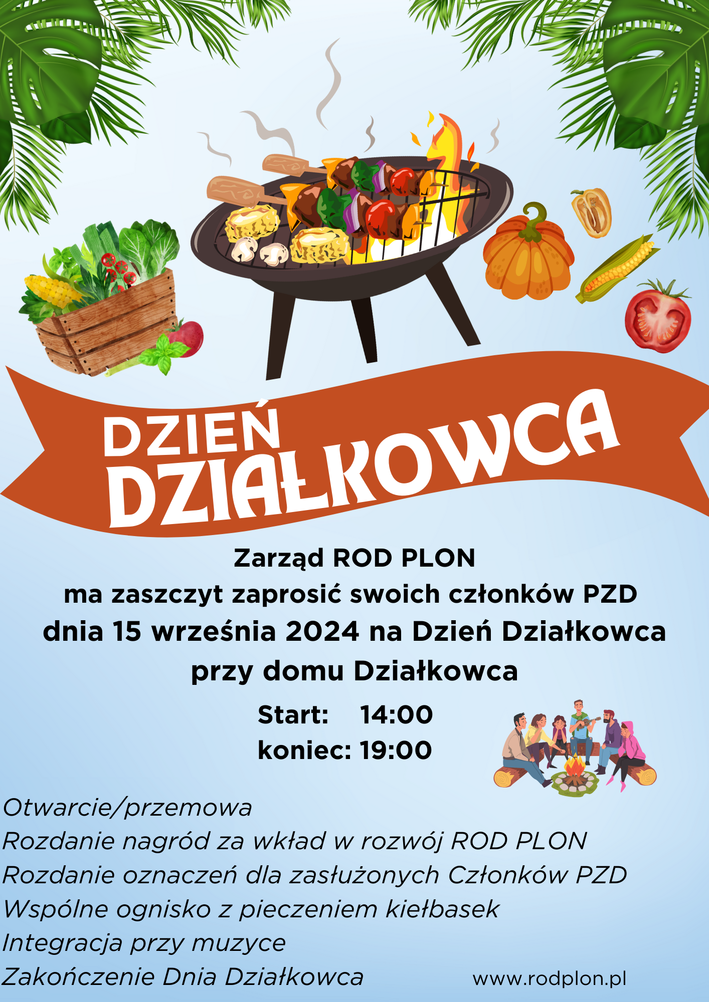 Zarząd ROD PLON ma zaszczyt zaprosić swoich Członków ROD PLON na Dzień Działkowca, który odbędzie się dnia 15 września w niedzielę o godzinie 14:00 na terenie ROD PLON przy budynku Zarządu.