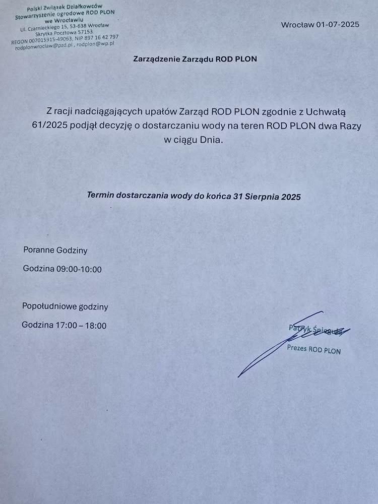 Informujemy, że od środy, 2 lipca 2025 r., zgodnie z uchwałą nr 61/2025, woda na terenie ogrodu będzie dostarczana dwa razy dziennie, aż do 31 sierpnia 2025 r., w następujących godzinach: