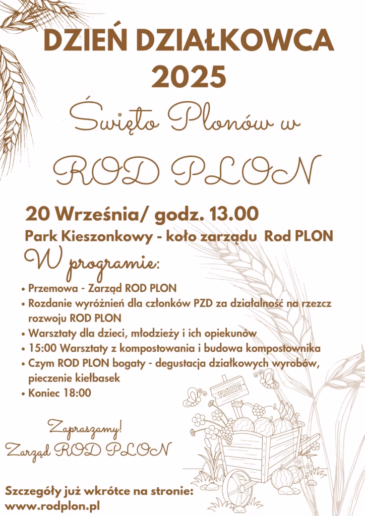 Zarząd ROD „PLON” ma zaszczyt zaprosić wszystkich działkowców wraz z rodzinami na Dzień Działkowca, który odbędzie się 20 września 2025 roku, start godzina 13:00, w Parku kieszonkowym przy Zarządzie ROD „PLON”.