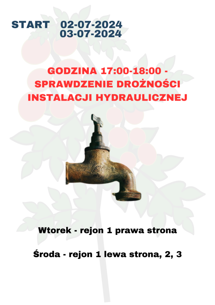 Dnia 03-07-2024 rejon I lewa strona i rejon II i III woda od 17:00 do 18:00