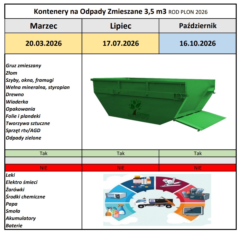 Zarząd ROD „PLON” informuje o terminach podstawienia kontenerów na odpady w najbliższych miesiącach:📅 20 marca 2026 r. 📅 17 lipca 2026 r. 📅 16 października 2026 r.⚠️ Przypominamy, że do kontenerów nie wolno wrzucać fekaliów ani środków chemicznych. Ekosystem - Harmonogram wywozu odpadów Kliknij aby sprawdzić, kiedy są wywożone odpady Kliknij aby się dowiedzieć jak segregować odpady